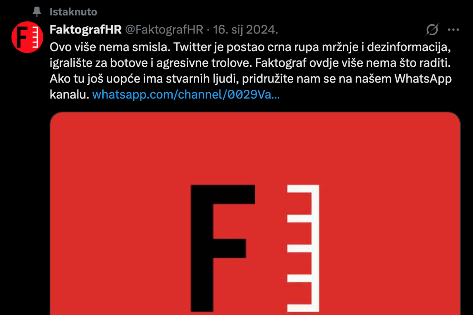 Ekstremno lijeva fact-cheking platforma Faktograf, koja štiti ekstremno lijevu stranku Možemo i „provjerava činjenice“ samo ako time može naštetiti desnom političkom spektru, napustila je 16. siječnja 2024. društvenu mrežu X. Dijete Hrvatskog novinarskog društ...